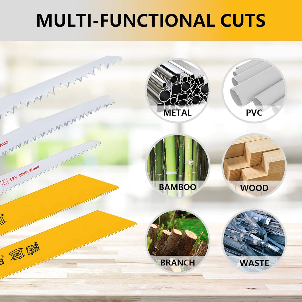 • ★ 【Sawzall Blades Metal & Wood】 - 4x 6" Wood 6TPI, 2x 8" Wood 6-10TPI, 2x 9" Pruner/Wet wood 5TPI, 1x 6" Metal blades 24TPI, 1x 6" Metal blades 18TPI, 1x 6" Metal blades 14TPI, 1x 6" Metal blades 10TPI. Different sizes to meet your different needs. With 2 colors silver and yellow which better differentiate of usage scenarios. The color of silver is more suitable for wood, and the yellow one is suitable for metal.
