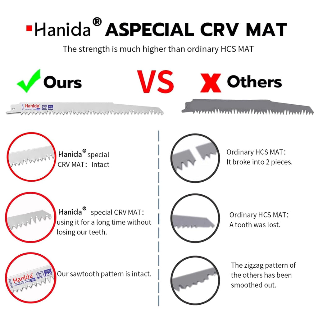 • 【Wide Applications】: Whether you need to prune your outdoor garden, cut wood and metal, trim bushes, or work with plastic pipes, Hanida reciprocating pruning saw blades will meet all your needs. Choose Hanida for reliable performance and superior cutting results.