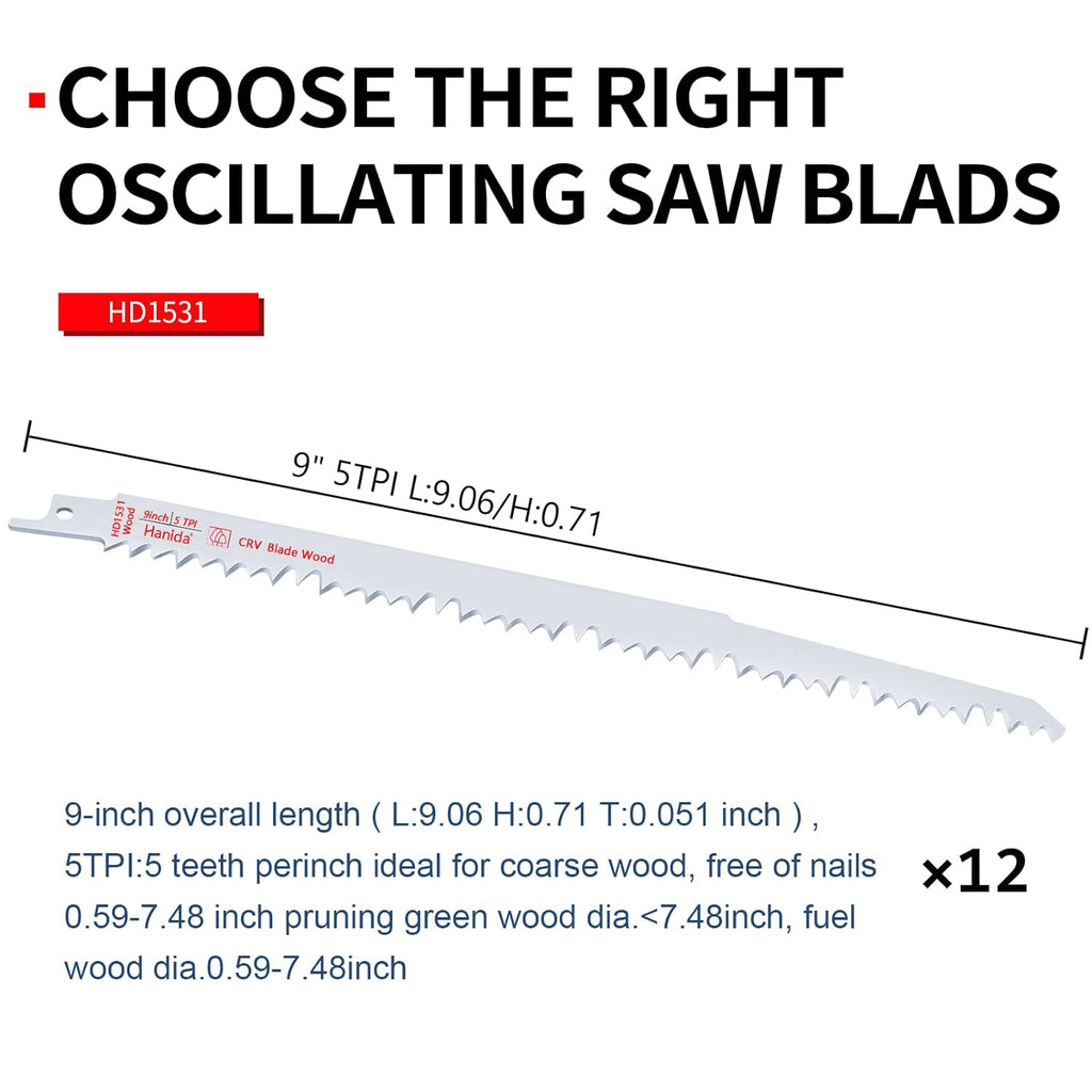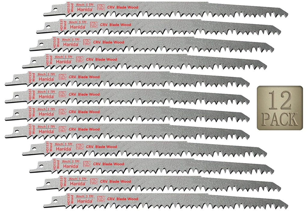 - ★ 【 Package Includes and Application 】 - 12 x 9" 5TPI, reciprocating saw blade. 0.059 inch ultra-thick thickness is used for extreme applications. Our reciprocating pruning saw blades are suitable for outdoor garden pruning, wood cutting, tree pruning and plastic pipe cutting. can cut rough/burning wood and other wood with a thickness of 0---6.89inch.
